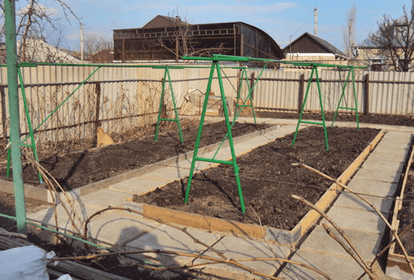 Якорные опоры, которые размещаются по краям грядки, необходимо установить немного наклоненными (достаточно соблюдать угол в 70 градусов), при таком расположении будет создаваться общая наклонность конструкции. Для того, чтобы произвести фиксирование каждой наклонной опоры, нужно воспользоваться растяжками из металлической проволоки. Свободный конец такой растяжки приматывают к металлическому уголку, а сам уголок закрепляется в земле под прямым углом (90 градусов).